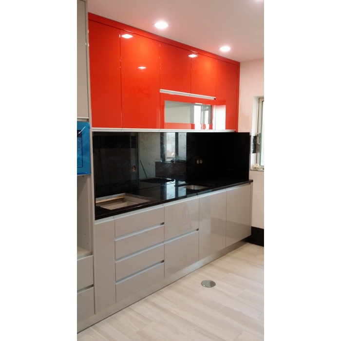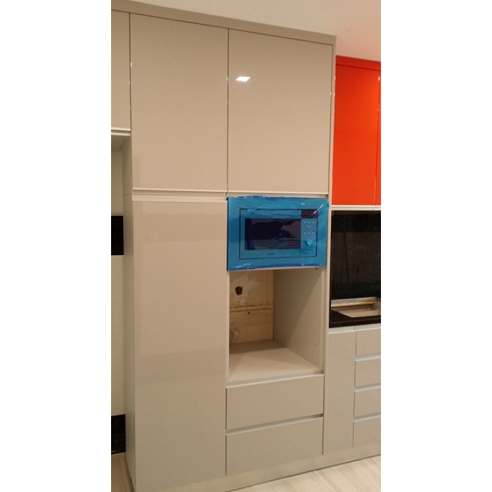 Cozinha Vermelha e Cinza Cozinha em Lacado alto brilho em vermelho nos móveis superiores e Lacado com 70% de brilho em cinza com tampo e parede Granito Negro Angola. Ver detalhes