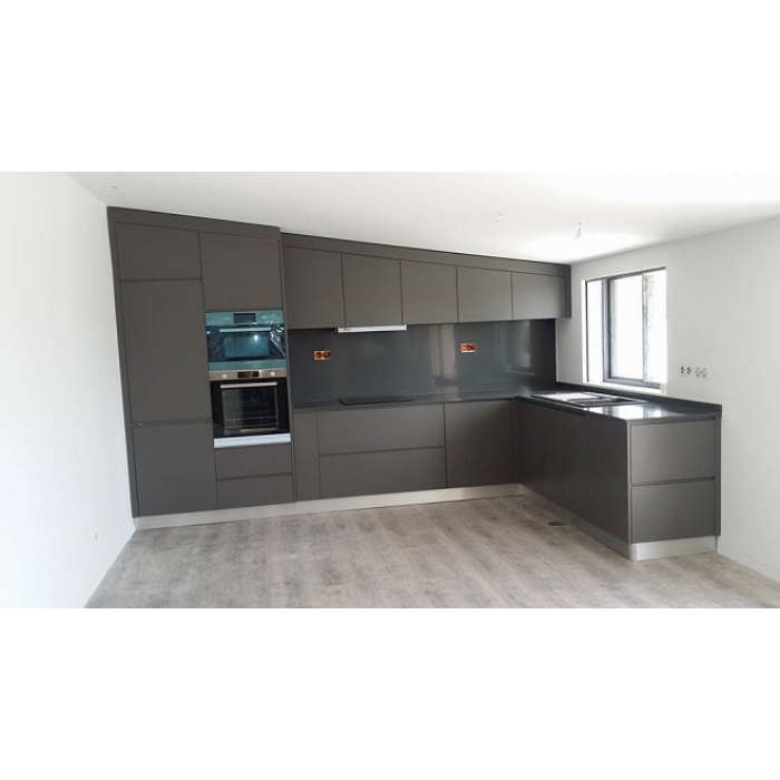 Cozinha Vermelha e Cinza Cozinha em Lacado alto brilho em vermelho nos móveis superiores e Lacado com 70% de brilho em cinza com tampo e parede Granito Negro Angola Ver detalhes