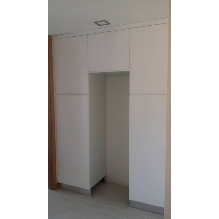 Cozinha Lacada Branco Pormenor do dispenseiro + espaço para frigorífico. Cozinha com interior Laminado + frentes Lacado Branco com 70% de brilho, com puxadores rasgados. Ver detalhes