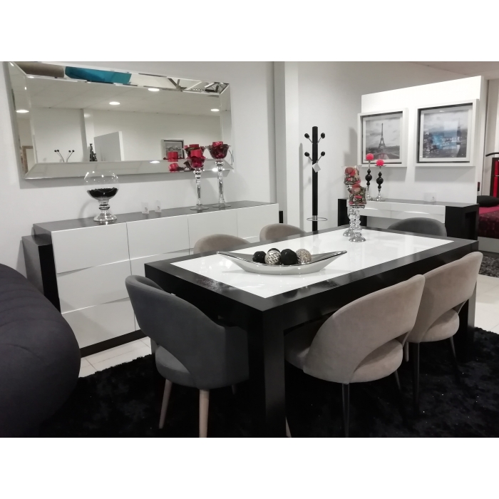 Sala de Jantar Coimbra Aparador com Carvalho Preto + Lacado 70% brilho Branco com 210 x 88 x 49,5. Moldura com 180x80. Mesa de jantar extensível em Carvalho Preto + extra claro branco com 170 x 77 x 100. Cadeiras e Cadeirões Vintage em Tecido Bronx + pés Carvalho Preto. Ver detalhes