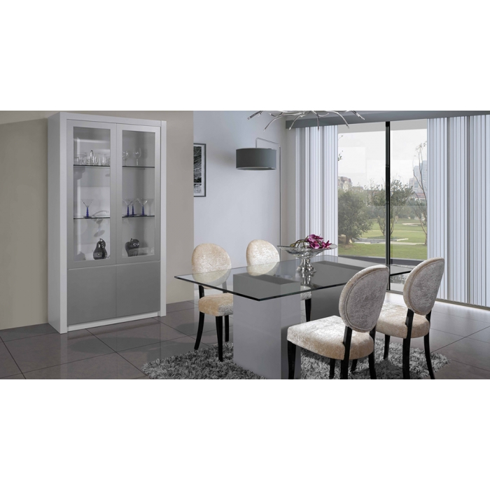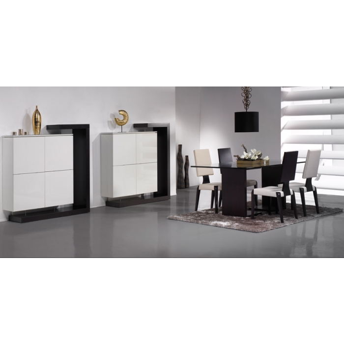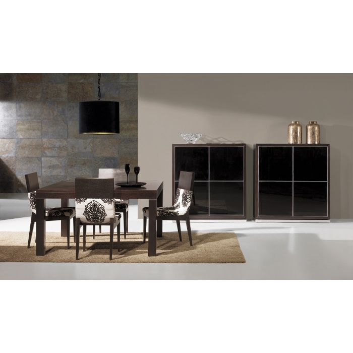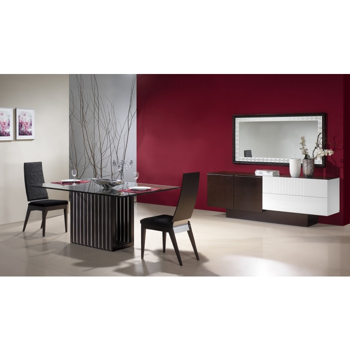 Sala de Jantar MR com Nogueira Aparador em Lacado Alto Brilho Branco + Nogueira com 200 x 90 x 50. Mesa de jantar em Nogueira + Vidro extra claro creme com 179 x 75 x 100. Cadeira em Veludo com pés em Nogueira. Ver detalhes