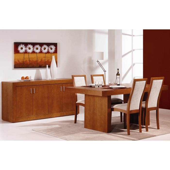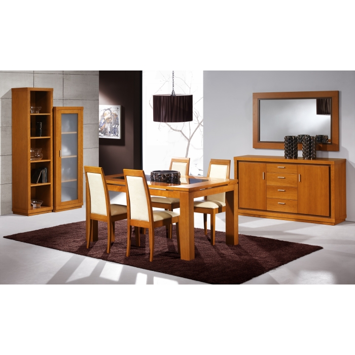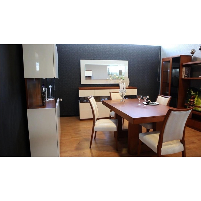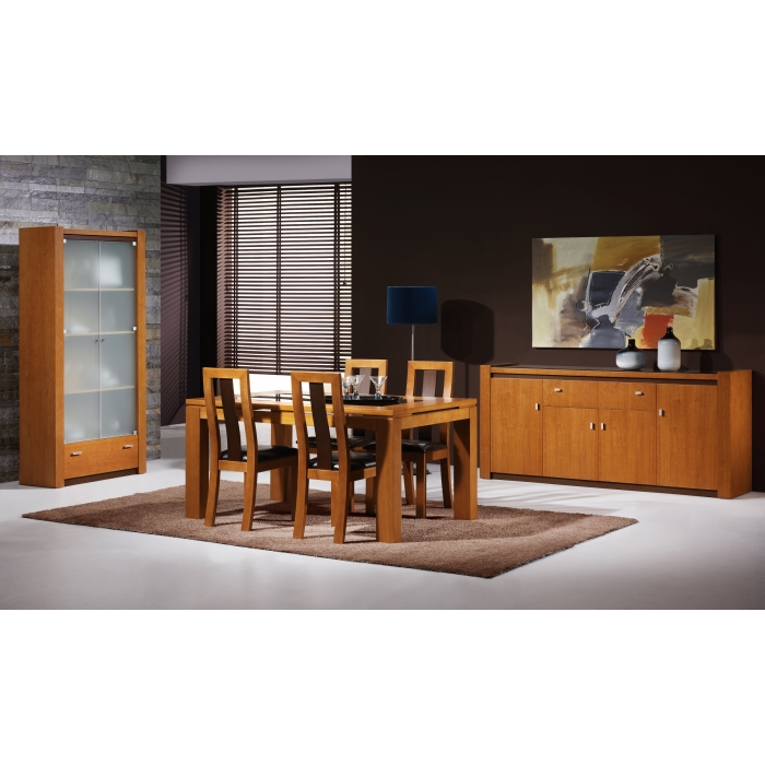 Sala de Jantar Cerejeira Sala composta por: Aparador em Cerejeira com 200 x 90 x 50. Móvel Bar em Cerejeira com 120 x 127,5 x 40. Mesa com vidro extensível em Cerejeira com 169 x 77 x 99,5. Cadeira S017 em Sintético Rena. Cadeira costa madeira em Cerejeira. Ver detalhes