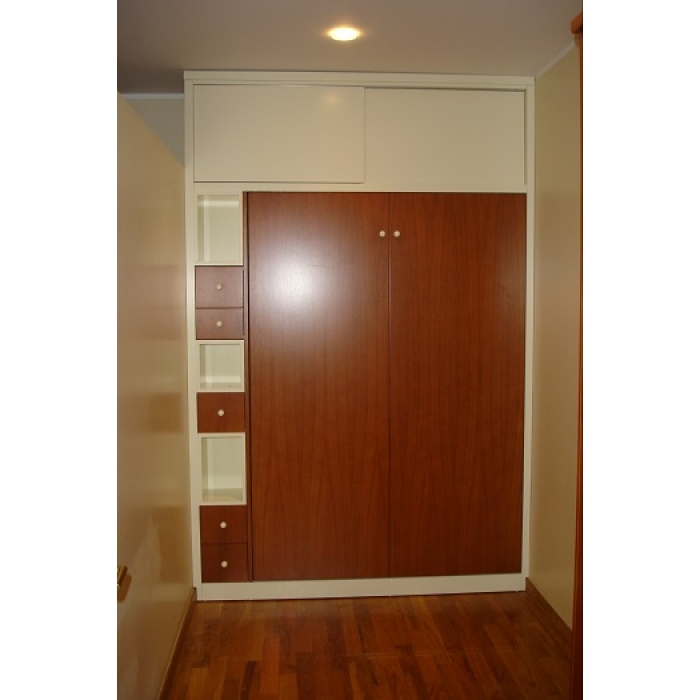 Roupeiro com estrutura elevatória Roupeiro em Lacado Branco com 70% de brilho + Cerejeira com estrutura elevatória para cama. Ver detalhes