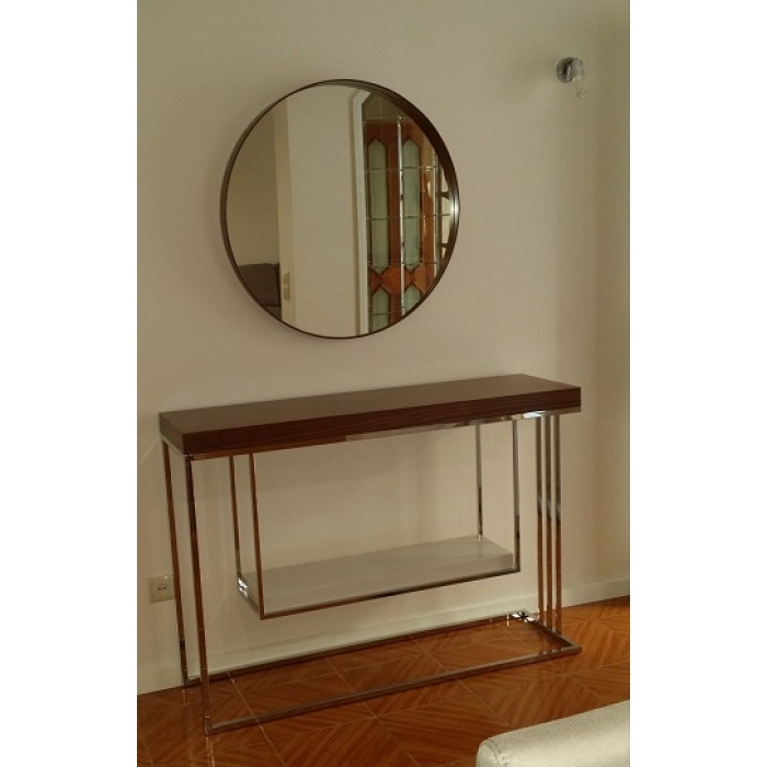 Consola Duplo Inox em Nogueira Consola em Nogueira 70% de brilho + Lacado 70% de brilho + Inox com 130cm x 90cm x 37cm. Espelho Redondo Moldura Saliente em Nogueira com 80cm de diâmetro. Ver detalhes