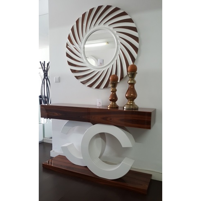 Consola Channel Consola em Lacado Alto Brilho + Pau Ferro Alto Brilho. Medidas totais: 180cm x 85cm x 55cm Moldura redonda em Lacado Alto Brilho + Pau Ferro Alto Brilho com 100cm de diâmetro. Ver detalhes