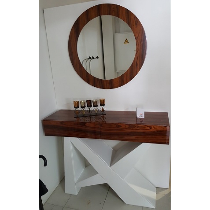Consola X Consola em Lacado Branco Alto Brilho + Pau Ferro Alto Brilho. Medidas totais: 120cm x 92cm x 35cm. Moldura/espelho em Pau Ferro 70 % Brilho com 80cm de diâmetro. Ver detalhes